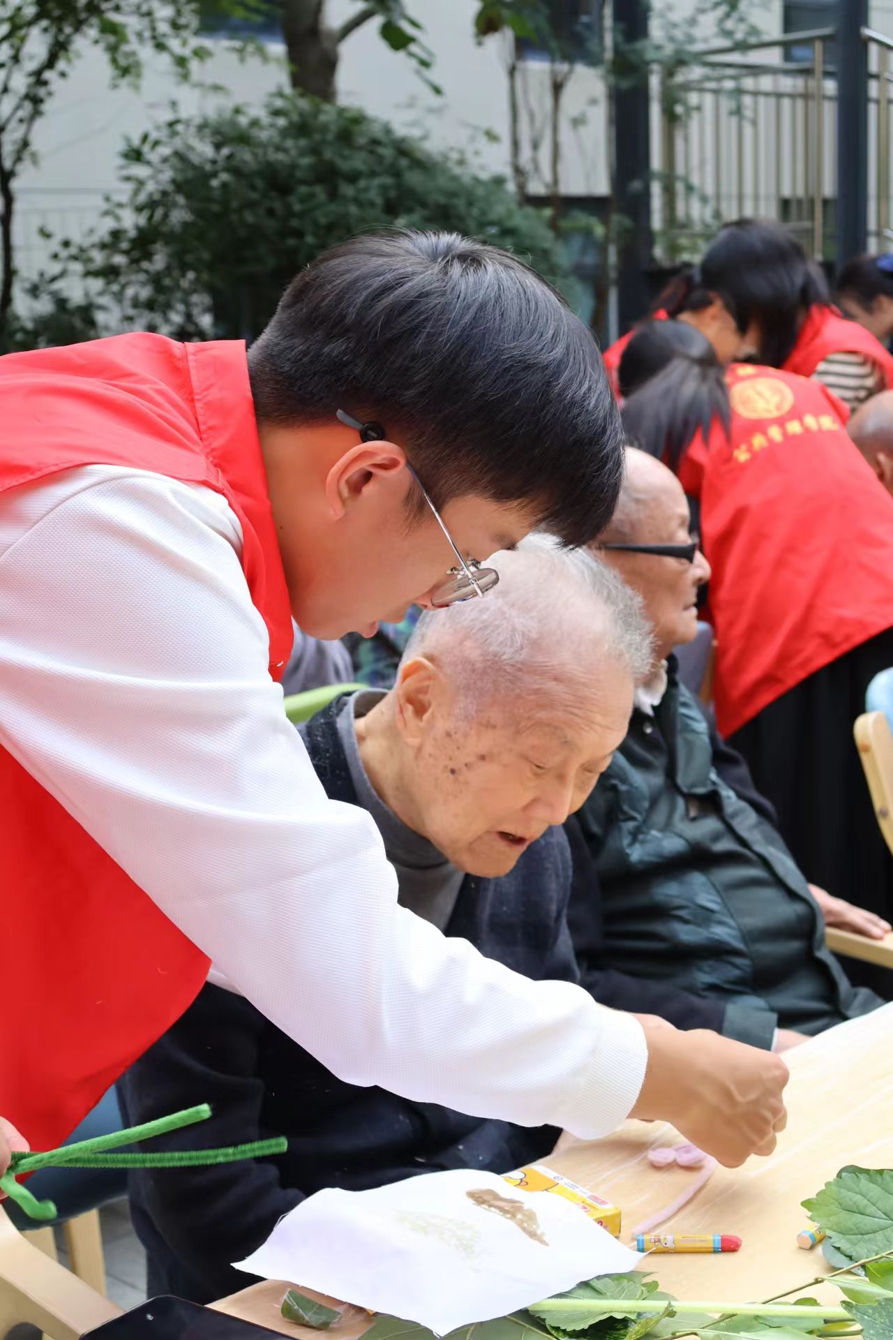 在老人们入座后,工作人员引导老人和志愿者们进行初步的认识。接着,志愿者们将已准备好的五颜六色的扭扭棒和精挑细选的绿叶挨个分发给每位老人,并耐心地介绍接下来的手工活动——扭扭棒花和树叶拓染。