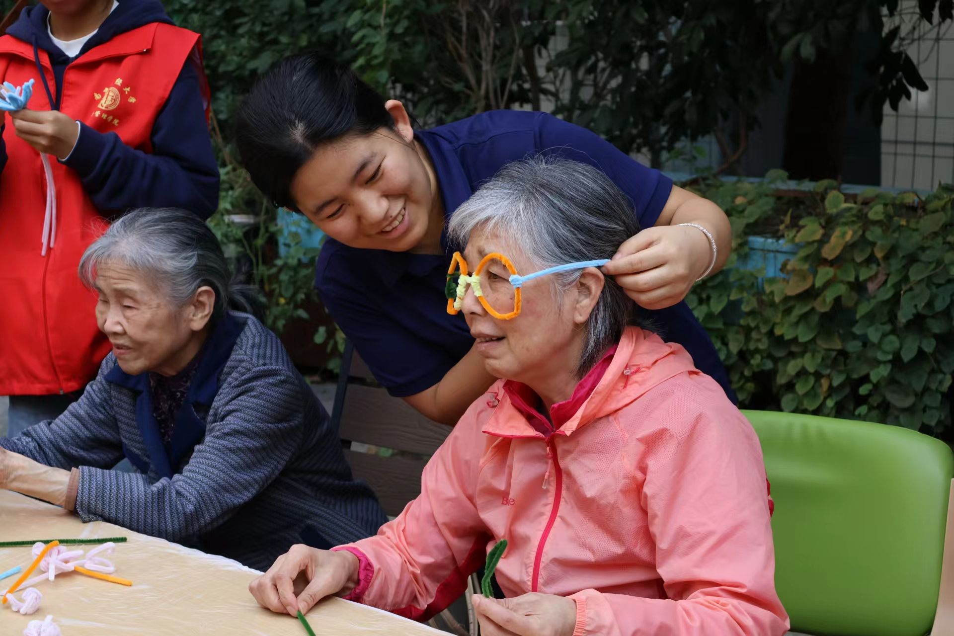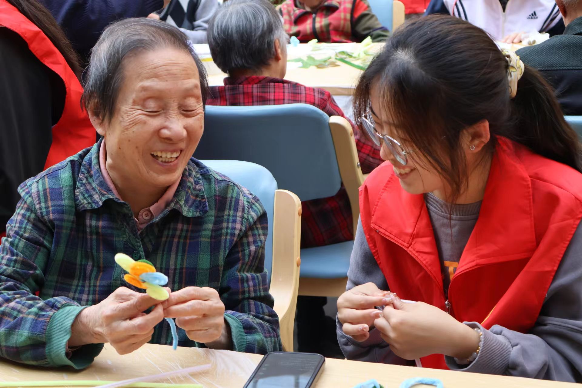 志愿者们各自分组协助每位老人制作自己想要的手工,老人们一边笑着敲动手中的小锤,扭着毛茸茸的扭扭棒,一边和志愿者们唠嗑闲聊,内心的喜悦感透过笑容控制不住地涌出来。