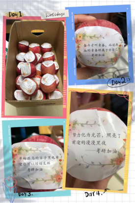 在老师和同学们的共同努力下,苹果成功送到了每个考研学子们的手上,贴纸上的一句句话语或许不是那样华丽,却足以打动人心。在这个寒风料峭的凛冬,给考研在即、压力颇大的学子们一份慰藉和鼓舞。