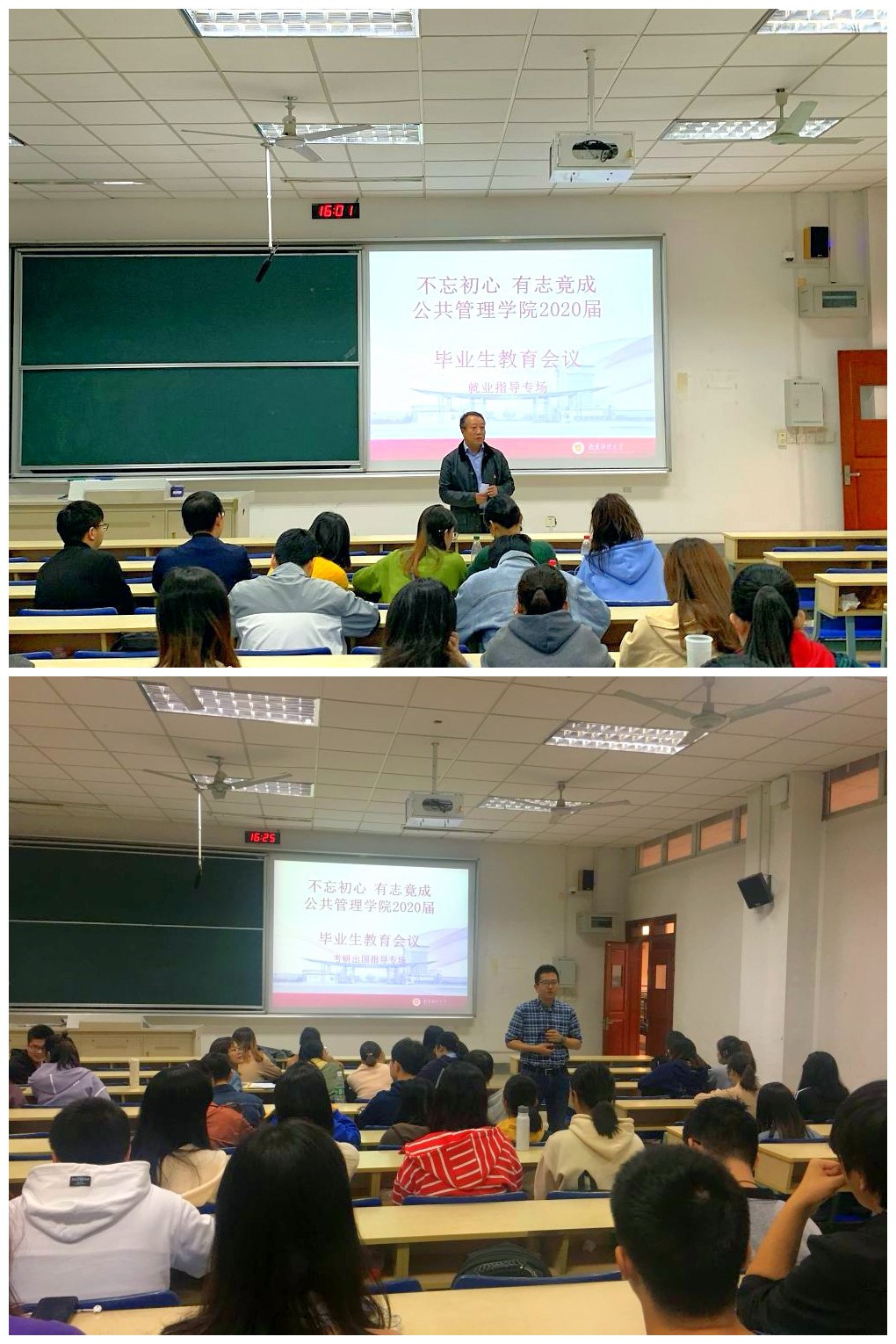 院长黄斌针对学生考研出国指导,党委书记胡永远针对学生就业指导,16级全体毕业生参加了此次会议。
