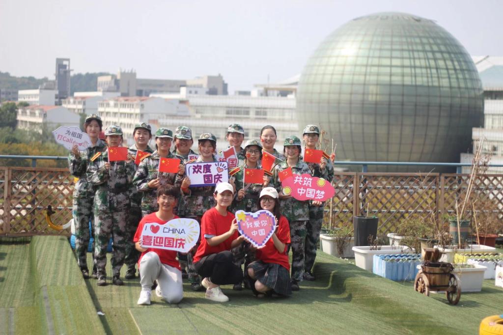 在精心装扮的学院耕读园一角,新生们挥舞着手摇国旗,举着祝福手牌,与国旗贴贴合照。新生们和国旗合照的大头贴拼凑成了偌大的“中国”两个字,表达对祖国的无限热爱。“中国”二字气势恢宏,彰显着中华人民共和国走过73年征程的强大力量;拼凑成“中国”二字的脸庞洋溢着青春的热情,预示着祖国欣欣向荣、蓬勃发展的光明未来。