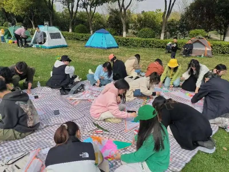 学生会负责人提前在羊山公园进行了活动地点的环境踩点,并铺好野餐垫,完成了场地布置,为同学们进行风筝绘画做好了准备。当天下午,同学们一起来到了羊山公园。大家围坐在野餐垫上,一人一组或两人一组开始了天马行空的想象和创作。有人照着手机小心翼翼地在风筝上描绘,画上自己喜欢的角色;有人则自信地打开颜料盒大笔挥画,让色彩在缤纷的世界里自由碰撞;也有人在风筝上书写愿望或是生活中所遇到的烦恼,希望心愿能够实现,而烦恼可以随春风一同扬升消散。