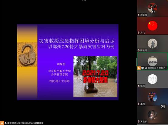 胡象明教授以河南郑州“7·20”特大暴雨灾害应对为例,从灾害情况、应急过程中的困境分析、应急指挥体制机制的困境分析、工作启示四个方面,结合具体案例及详细数据,阐释应急指挥需要充分做到精确性、高效性、有效性。通过讲座,总结出“五要”:应急指挥系统要有高度的风险意识和过硬的指挥能力,各级政府要重视应急预案的制定和落实,各级各类机构要实现由常规运行机制向应急运行机制的转换,信息平台的建设要实现有效整合统一指挥,应急通讯系统的建设要努力实现现代化。学员们认真聆听,仔细记录,围绕应急预案制定及落实、应急信息资源共享、西部欠发达地区应急救援等进行提问,胡教授给予精彩解答,学术讨论气氛热烈。