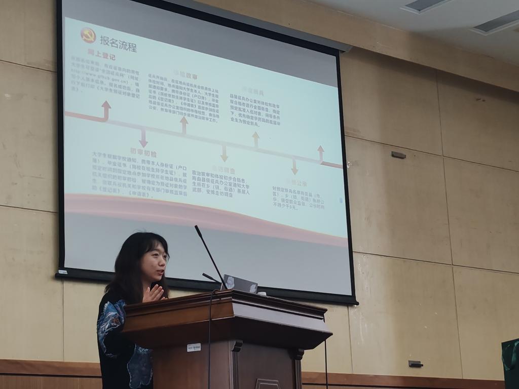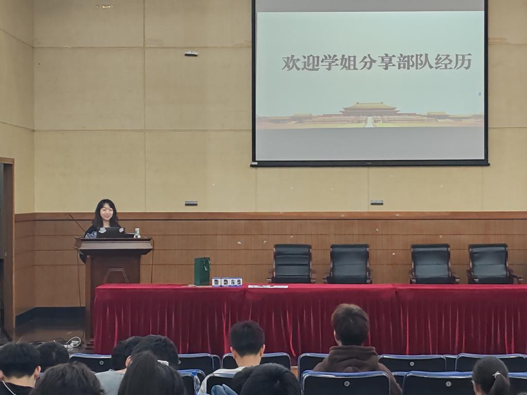 本次讲座从参军基本条件、报名流程、参军意义三个方面进行宣传。