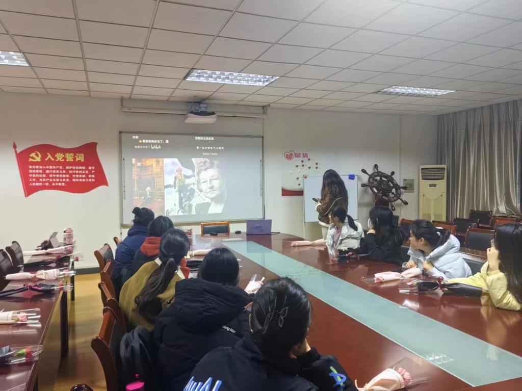 在德济楼508举办以“致敬‘她力量’”为主题的三八妇女节活动。活动一、大家一起观看关于“三八妇女节”的视频;活动二、大家互相交流感想;活动三、大家围坐在一起用扭扭棒编花;活动四、为大家分发鲜花和巧克力;活动五、所有人一起合影留念。