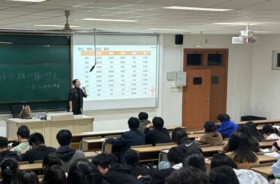 同时,老师也为大家带来了许多相对精确的就业数据,让同学们更为直观地感受到就业形势的严峻。面对考研、留学、就业、考公几个方向,老师精准剖析每一个选择的利弊得失,打破同学们的刻板印象与“不切实际”的幻想。