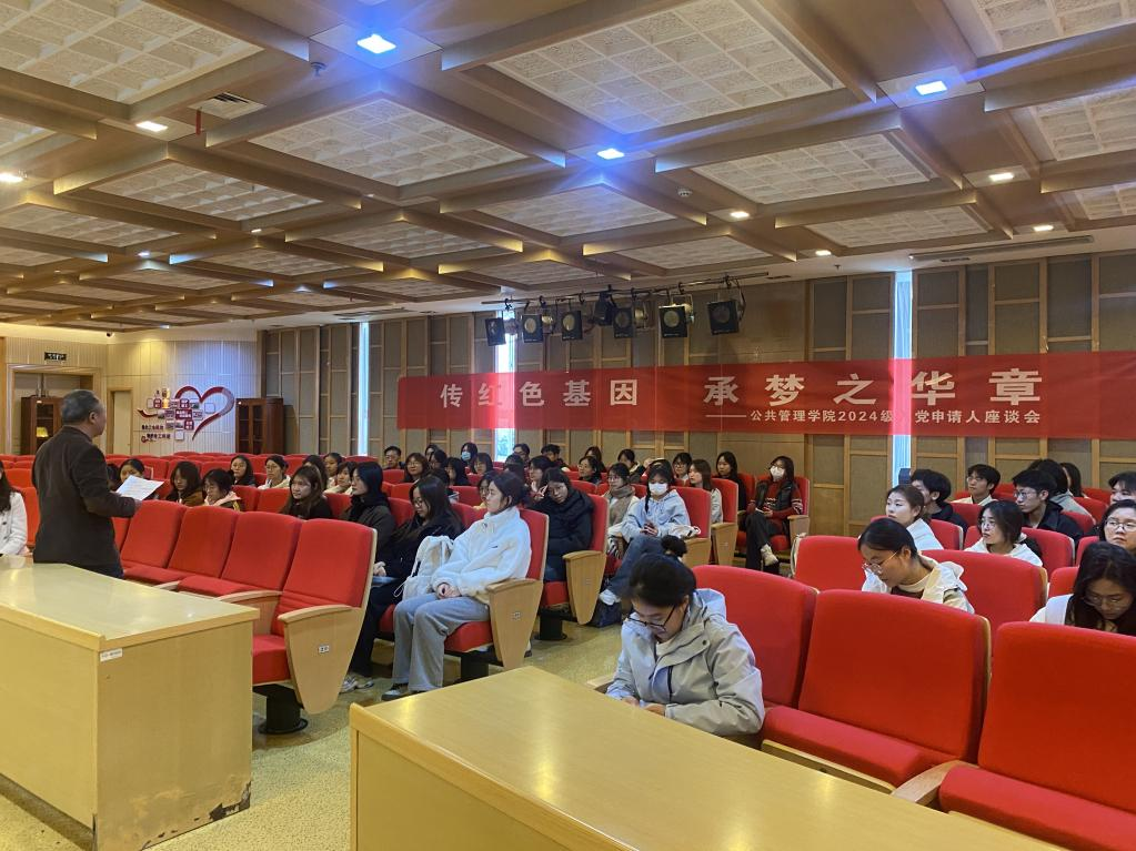 在图书馆一楼音乐厅召开2024级新生入党申请人主题座谈会。参加本次会议的有学院原党委书记胡永远教授、本科生党支部书记高敏、2024级新生辅导员尹杰以及2024级全体本科新生入党申请人。会议由尹杰老师主持。