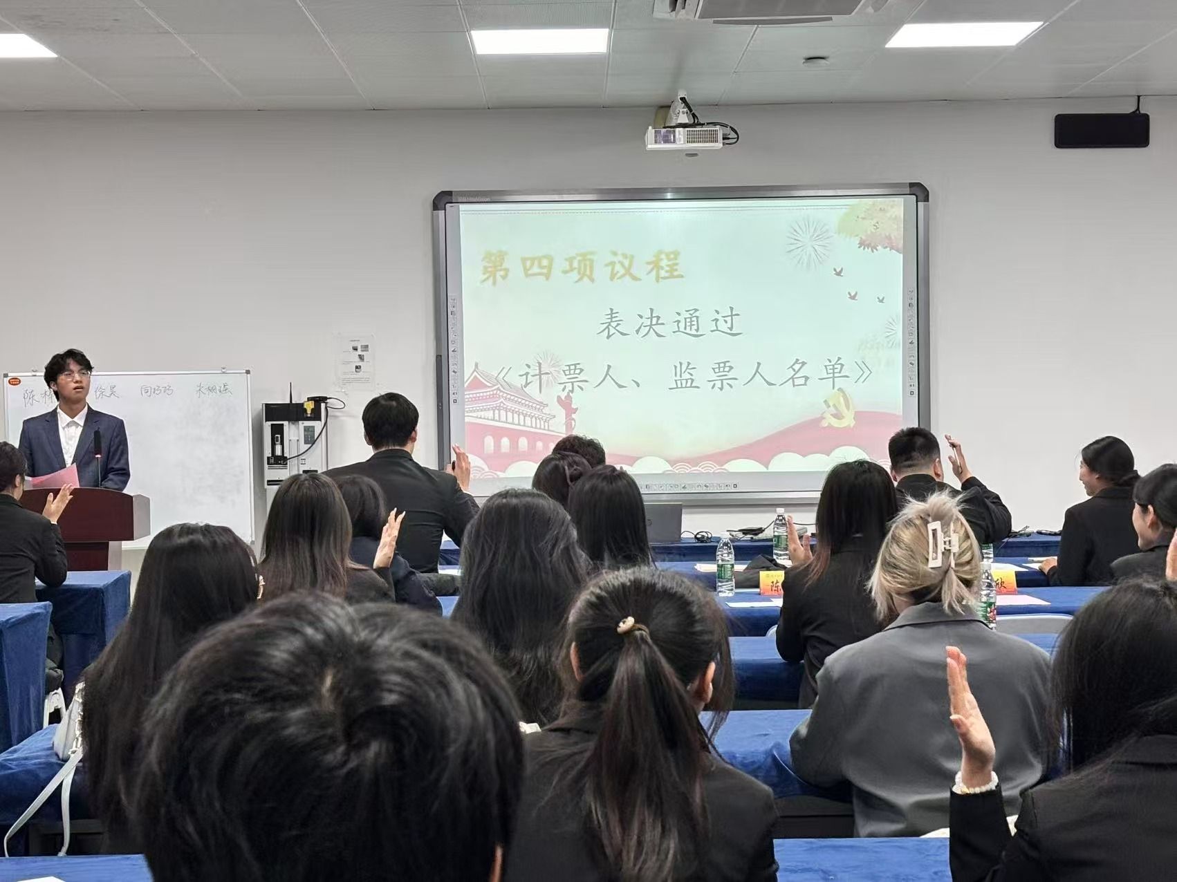 第四项议程——表决通过《计票人、监票人名单》。主持人详细介绍了《计票人、监票人名单》具体细则,全体表决通过了计票人、监票人名单,并宣布计票人为杭鑫,监票人为冯冠诚。