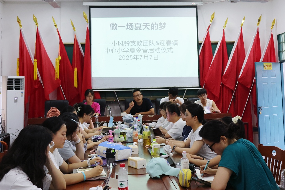 “每一个风铃的响动,都是远方的牵挂在回应。”迎春镇中心小学肖主任在发言中,以支教队的“风铃”之名喻情,对南财师生的到来表达热烈欢迎。她提到,乡村孩子的成长需要更多元的视野,小风铃支教队带来的特色课程恰如一阵清风,将为校园注入新的活力。校长也在发言中承诺,校方将全力配合支教工作,为师生们提供保障,让这段时光成为孩子们夏日里最珍贵的记忆。