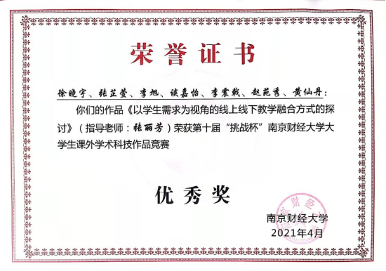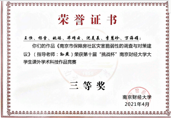房地产专业王恒小组、徐晓宇小组同学的作品“南京市保障房社区灾害脆弱性的调查性与对策建议”以及“以学生需求为视角的线上线下教学融合方式的探讨”两个作品分别荣获十届“挑战杯”黑料网 大学生课外学术科技作品竞赛的三等奖和优秀奖。指导老师分别为孙燕、张丽芳。