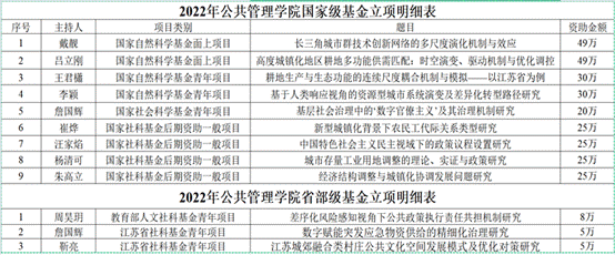 学院高度重视科研立项的组织管理工作,围绕公共管理的前沿问题,服务国家战略需求和地方经济社会发展需要,在兼顾学术兴趣的前提下加强“有组织科研”,多次精心组织同行专家对选题方向和项目内容进行论证和遴选。2022年,学院共有9项国家级课题获得立项资助,人均立项率和立项总数在全校名列前茅,立项数及获批资助经费均创建院以来的历史新高,其中国家社会科学基金5项、国家自然科学基金项目4项(面上项目2项),共获批资助经费278万。另外,学院还有3项省部级科研课题获得资助立项,其中教育部人文社科青年基金1项,江苏省社科青年基金2项。