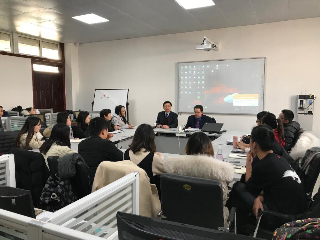 讲座由Smith教授对唐纳德•特朗普的介绍开始。Smith教授认为,特朗普在美国政治中扮演着“改变”和所谓“政治错误”的角色,这也使他赢得了“沉默的大多数”的支持,成为美国第45任总统。在处理国际关系中,Trump的“商人思维”贯穿始终,倾向于以商业谈判的方式最大化美国利益。Smith教授认为,“政治素人”特朗普的上台为中美关系的发展带来了更多的不确定性因素,但随着“海湖庄园”会晤以及特朗普访华的进行,中美选择合作而非对抗仍是大势。胡晓波教授首先呼吁,作为经济管理类学生应当具有国际视野,关注国际问题尤其是中美关系。之后,胡教授进一步探讨了全球化与逆全球化、精英主义与民粹主义等问题。最后,Smith教授与胡教授与老师同学们就当今热点政治经济问题进行了热烈的讨论。