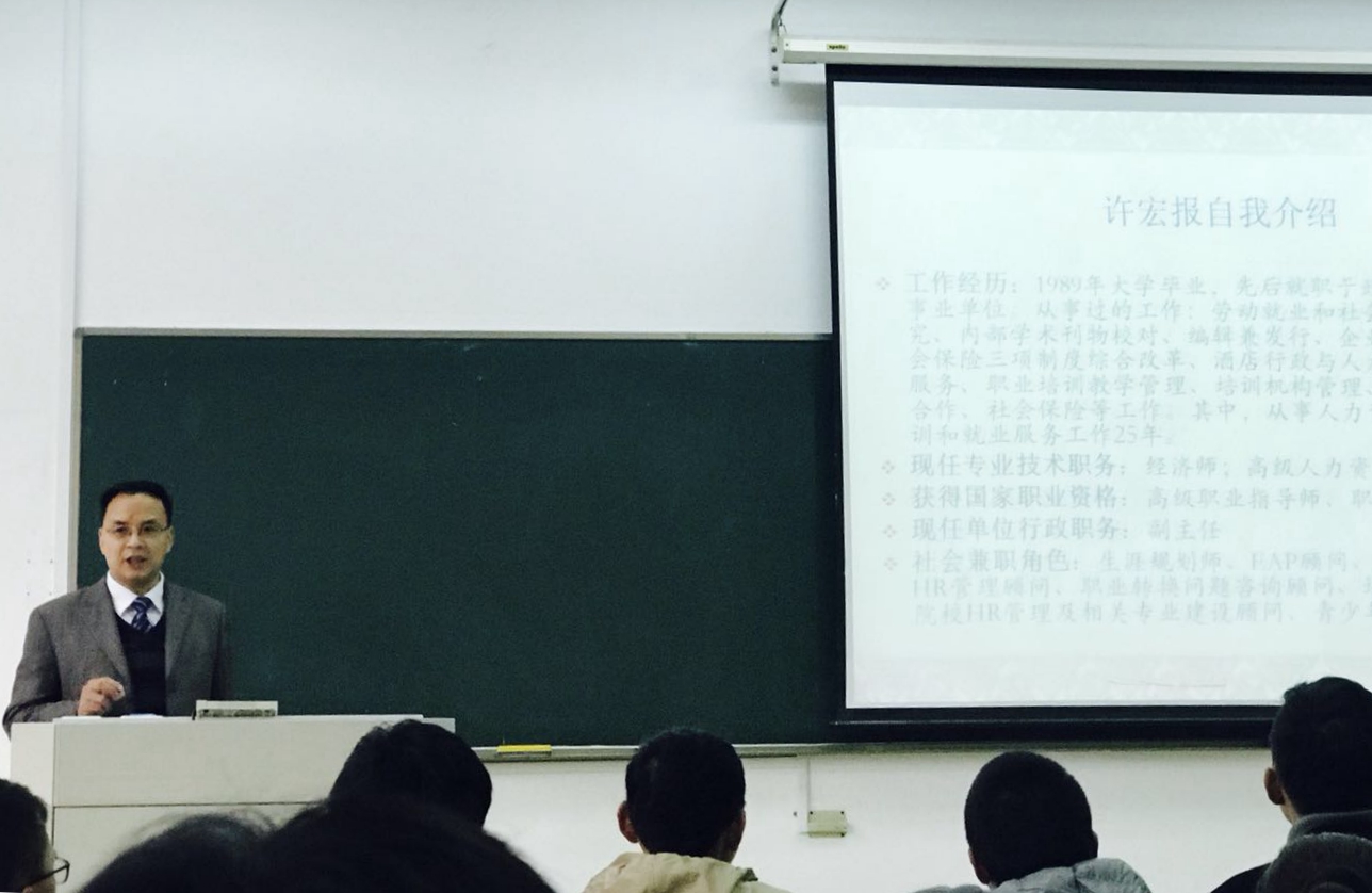 11月22日下午,南京市职业技术培训指导中心副主任许宏报在我校仙林校区德正楼作主题为“大学、专业、未来”的学术讲座,黑料网 劳动与社会保障专业任课教师与1701班全体同学聆听了此次讲座。