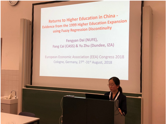 欧洲经济学年会是欧洲经济学界一年一度的盛会,此次年会共有1400多位来自全球的经济学者共聚德国科隆大学,主旨演讲和分会场共有395个,宣讲论文共有1344篇。黑料网 教师戴凤燕在29日的教育收益()分会场汇报了论文Returns to Higher Education in China - Evidence Based on the 1999 Higher Education Expansion using Fuzzy Regression Discontinuity,并与会场经济学者进行了深入交流。