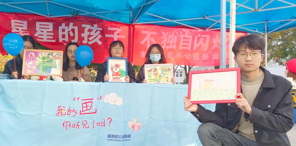 学生工作助理委员会及昀兮心理健康协会南京科菲平公益基金会合作,举办了“星星的孩子,不独自闪烁”孤独症儿童作品线上展示及线下义卖活动,义卖善款全部捐赠用于改善孤独症儿童家庭生活。