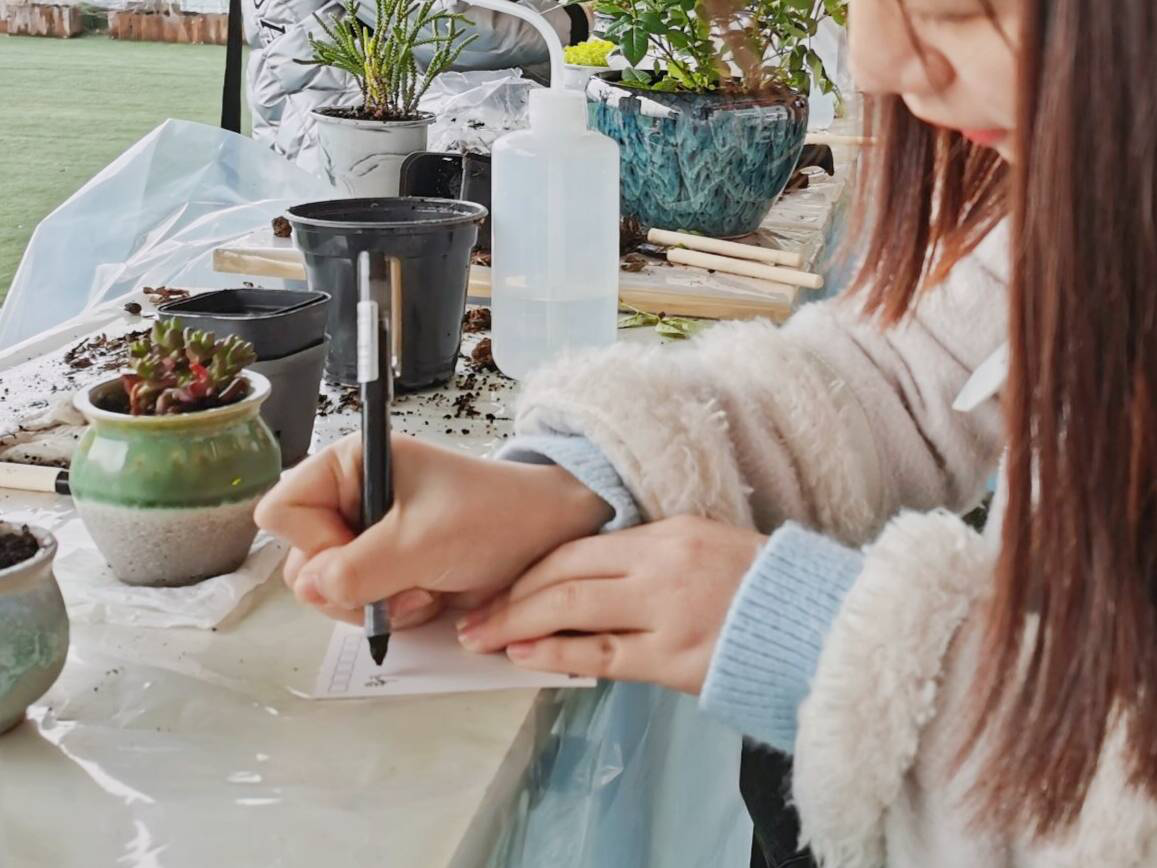 随后,冯颖老师牵头组织大家进行心愿卡的撰写。同学们用文字书写下自己对未来的憧憬和对保护环境的呼吁,并将心愿卡与自己认领的标签张贴在自己的绿植上。