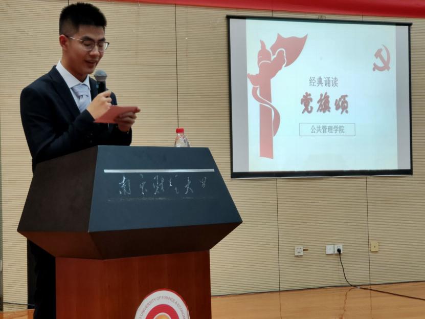 参赛作品——《党旗颂》由十位同学演绎。参与同学身着红色院服,既表现了“大爱公管”的精神,更体现了公管学子对祖国、对党的满腔热忱!