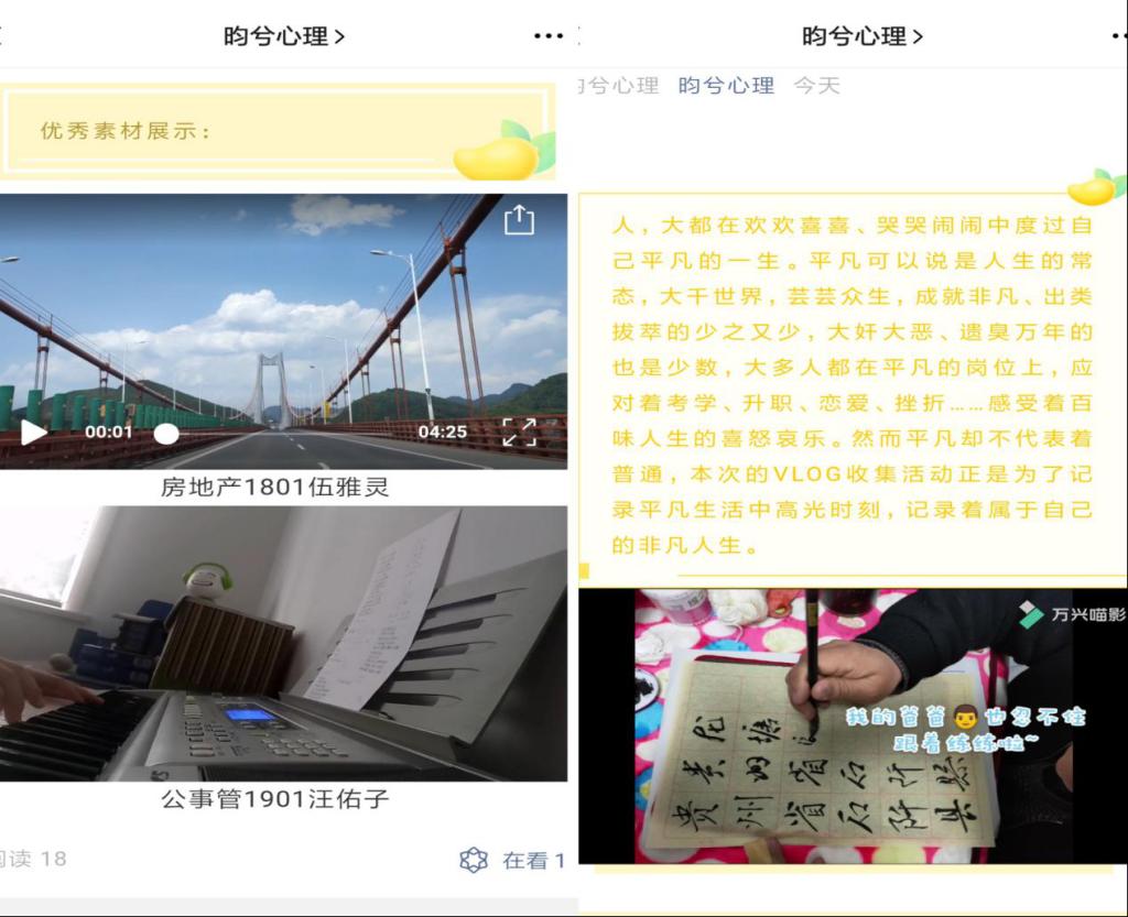 昀兮心理开展“平凡却不普通的一天”VLOG活动,同学们通过视频记录自己的生活,与家人温馨的相处,与朋友欢乐的时光。其中房地产1801的伍雅灵同学的投稿丰富而精彩,一天的时光漫漫而有趣,公事管1901汪佑子同学一段精彩的自弹自唱,都是同学们生活中真实的片段。
