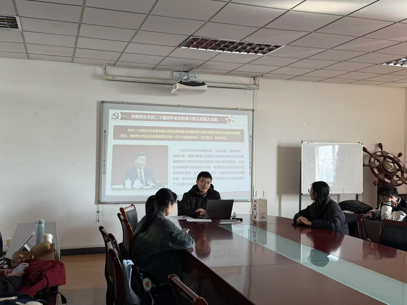 11月21日中午12:40,支委会在德济楼508会议室召开支部大会,由党支部书记史晟主讲党课,专题宣讲党的二十届四中全会精神,推动全会精神落地生根。
