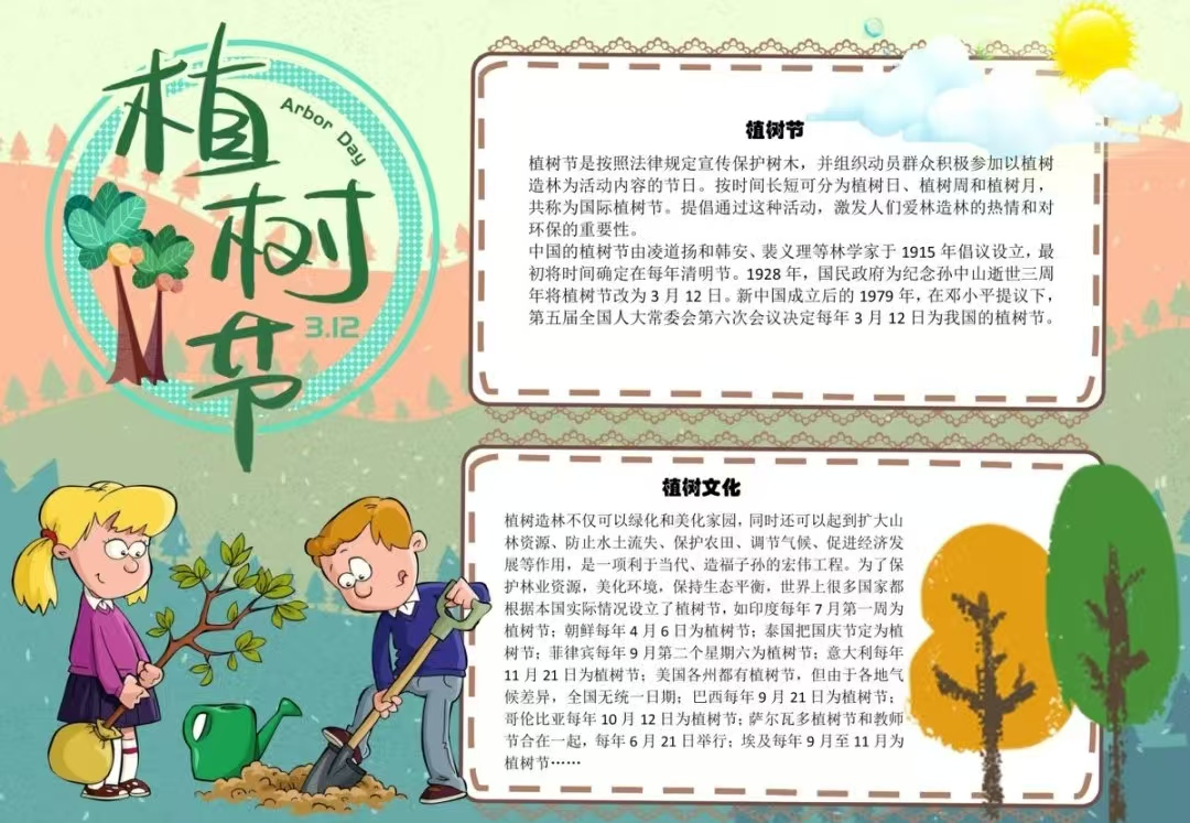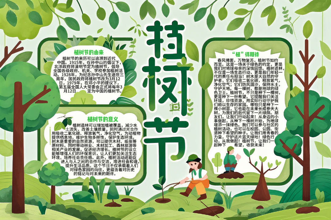 这张植树节手抄报以清新明快的绿色为主调,洋溢着蓬勃的生命力。最上方用极具创意的 “播种绿色” 手绘图案和苍劲有力的 “植树节” 艺术字吸引住大家的目光。中间部分又以地球为核心画面,城市与绿树和谐相融,“爱护地球 植树造林” 的文字直抵人心,凸显环保理念。手抄报的文字内容写了植树节的起源和意义,像我国将孙中山先生逝世的 3 月 12 日设为植树节,意在倡导人们积极投身造林护林行动,增强环保意识,守护美丽家园。右下角的树苗、铁锹图案,生动展现植树场景,同时文字部分也在号召大家亲身参与,为大地增添一抹抹新绿。